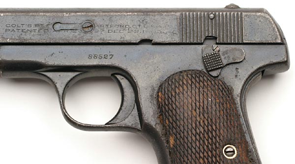 Close-up of 1908 Pocket Hammerless .380 ACP serial number 88527 showing slide modification and screw used to hold open the thumb safety.