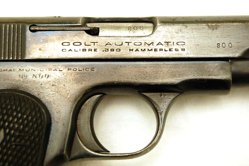Colt 1908 Pocket Hammerless .380 ACP Serial Number 88986, No. 800 - The earliest pistols acquired for the Shanghai Municipal Police were at least 270 in quantity (based on SMP records) with no indication of caliber.  It is presumed that these were obtained from commercial distributors since there are no Colt records of these shipments documenting a contract order prior to the Colt documented contract shipments from 1925 to 1938.