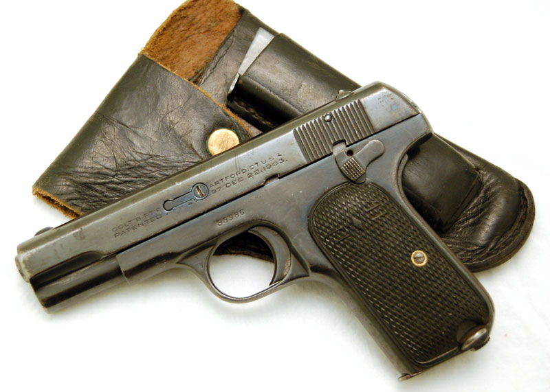 Colt 1908 Pocket Hammerless .380 ACP Serial Number 88986, No. 800 - pictured with holster that accompanied this pistol.