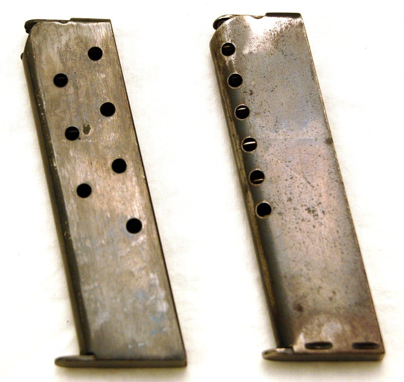 Colt 1908 Pocket Hammerless .380 ACP Serial Number 88986, No. 800 - accompanying magazines.  Magazine on right has the typical viewing holes present on magazines that shipped with SMP marked pistols.