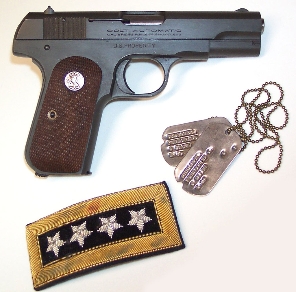 Colt Model 1903 Pocket Hammerless .32 ACP pistol serial number 567426 - Right side, pictured with his dog tags and four star shoulder board.