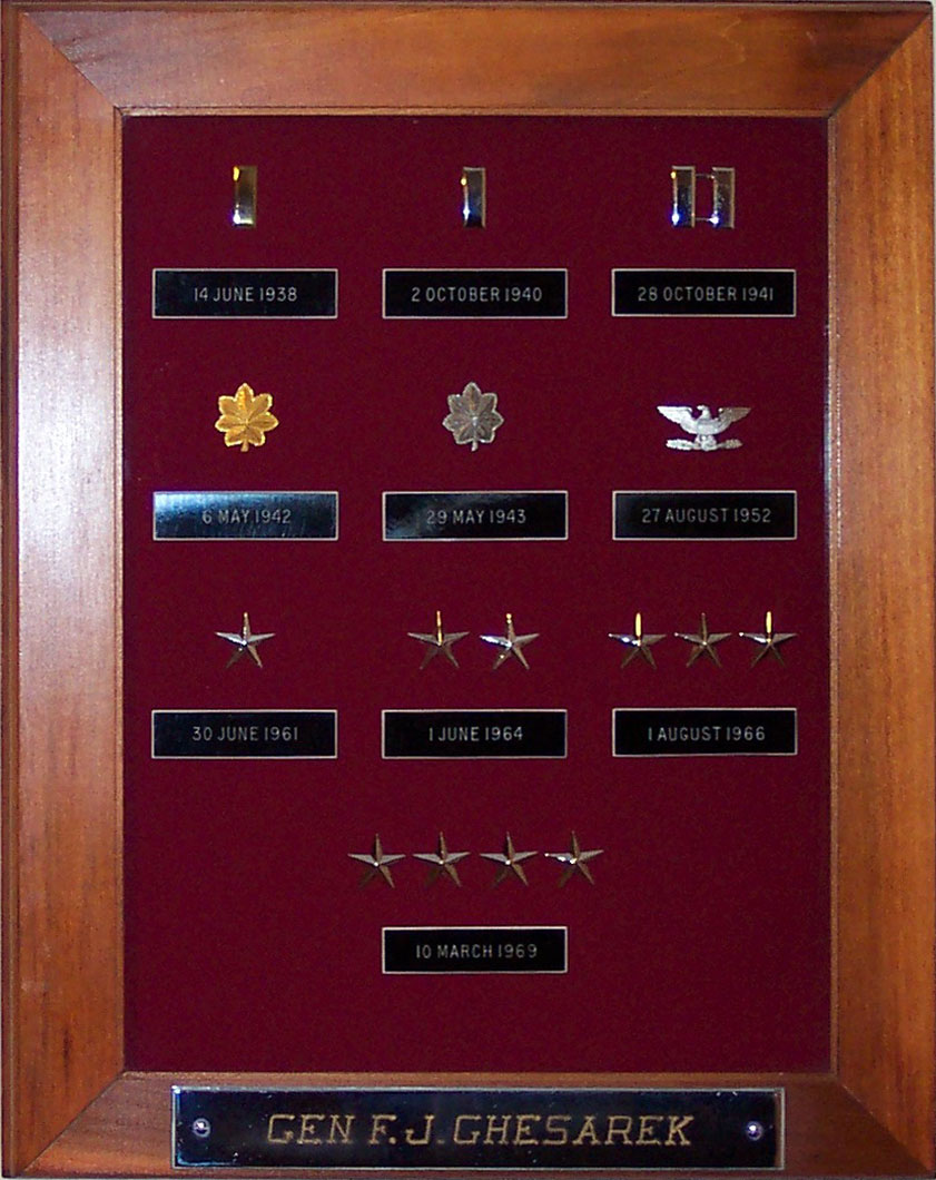 Gen. F.J. Chesarek or Ches as he was known to friends and family was born on 18 Feb. 1914 in Calumet, MI.  He graduated from West Point in 1938. After assignments to the 9th Field Artillery Reg. at Ft. Lewis, WA and the 9th Field Artillery Reg. at Ft. Ord, CA and the 81st Field Artillery Bat. at Ft. Richardson, AK Ches went on to the Alaska Defense Command also at Ft Richardson, AK in 1941.  Several more assignments included S-3, 177th Field Artillery Reg. at Ft. Leonard Wood, MO, Student at Field Artillery School, Ft. Sill, OK and Executive Officer, 177th Field Artillery Group at Camp McCoy, WI.