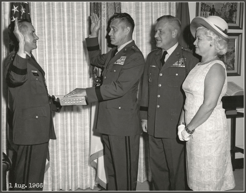 USAPA 66 A-1347-2 (1 August 1966) - Lt. General F.J. Chesarek was sworn in as the Comptroller of the Army. Shown LtoR: Brig General L.H. Walker, administering the oath; Lt General Chesarek; General Creighton W. Abrams, Vice Chief of Staff and Mrs. F.J. Chesarek. Ceremony followed the promotion of Major General Chesarek to Lt General at the Pentagon, Washington, D.C.  Photo by: Wayne C. O'Neill, U.S. Army Photographic Agency, Washington, D.C.