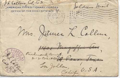 Two original covers:  Top addressed to Lt. Col James L. Collins, American Expeditionary Forces, France; bottom addressed to Mrs. James L. Collins from Col. J. L. Collins, General Staff.