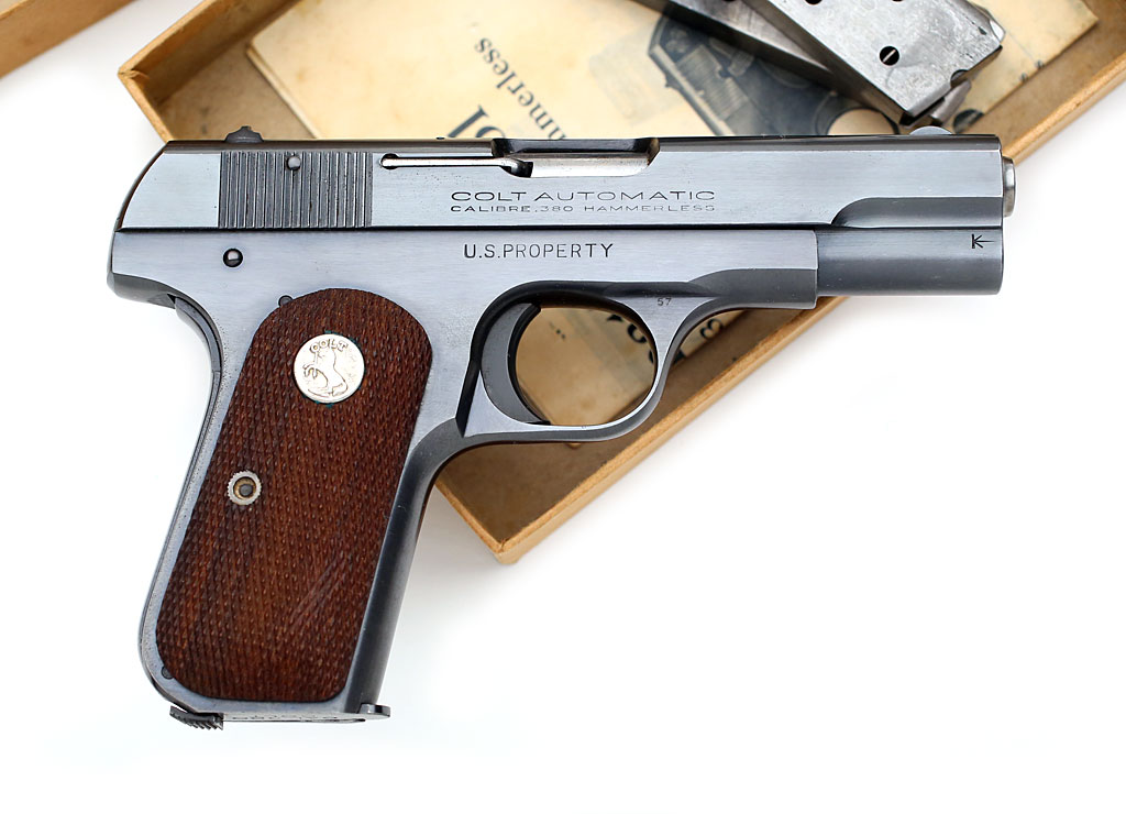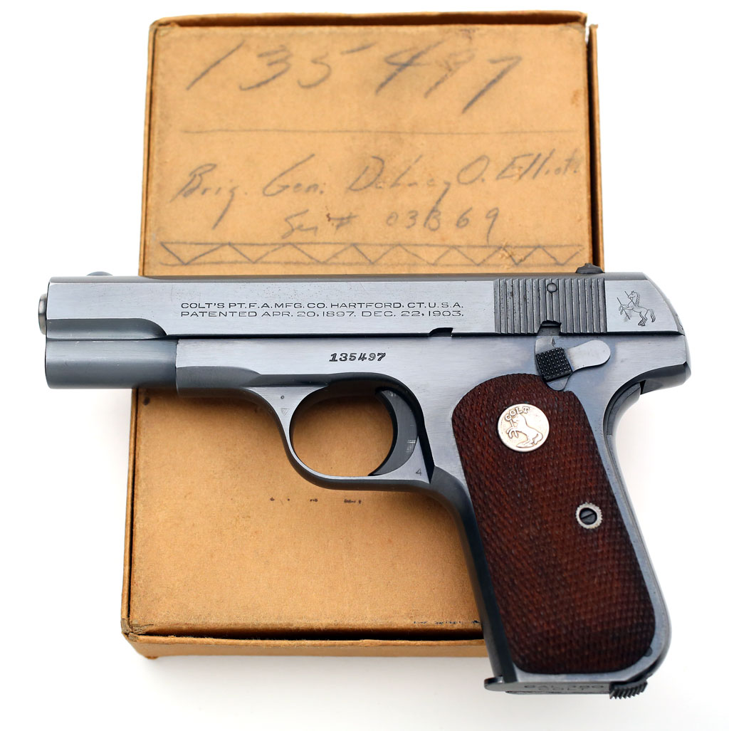 Colt Model 1908 Pocket Hammerless .380 ACP - Issued to Brigadier General Dabney Otey Elliott, with original box, instructions and spare magazine and his Model 1900 American Eagle Luger 7.65mm