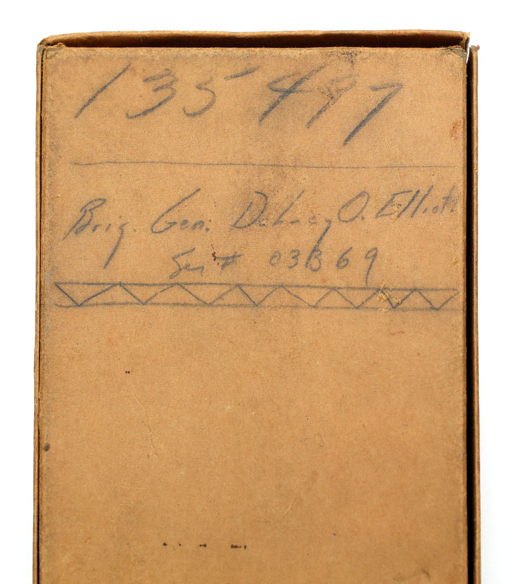 Colt Model M .380 ACP serial number 135497 issued to Brigadier General Dabney Otey Elliott - Bottom of original box showing serial number and "Brig. Gen. Dabney O. Elliott" written over "Ser # O3369".  This could be an error as BG Dabney's number is also recorded as "O-3669".