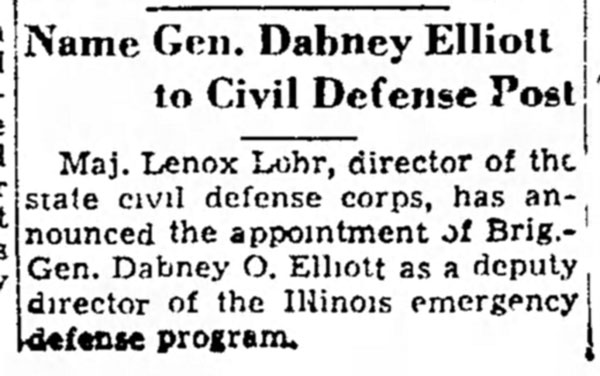 Name Gen. Dabney Elliott to Civil Defense Post - Maj. Lenox Lohr, director of the state civil defense corps, has announced the appointment of Brig. Gen. Dabney O. Elliott as a deputy director of the Illinois emergency defense program. (ca. 1950)