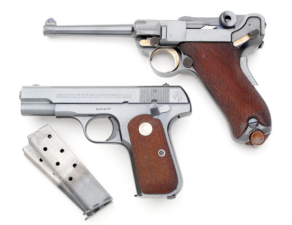 Colt Model 1908 Pocket Hammerless .380 ACP serial number 135497 and American Eagle  Luger Model 1900 7.65mm serial number 6060 - these pistols are from the estate of  Brigadier General Dabney O. Elliott.  This Luger has all the characteristics of the 1,000 test pistols ordered by the U.S. Government and based on the available historical information, it's inconclusive if this pistol was one of the actual test pistols. (Some collectors count only those guns from the known Bannerman sales following the military trials as legitimate Model 1900 Test Lugers.)