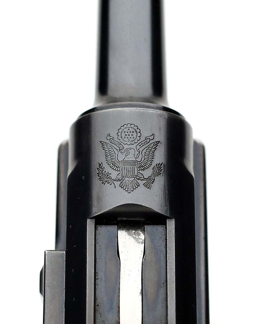 American Eagle Luger Model 1900 7.65mm serial number 6060 with original holster - this pistol belonged to Brigadier General Dabney O. Elliott. The Luger has all the characteristics of the 1,000 test pistols ordered by the U.S. Government and based on the available historical information, it's inconclusive if this pistol was one of the actual test pistols. Of note, the style of American Eagle on pistol 6060 has "squared tail feathers" which is the same marking as those observed on pistols 6005, 6018, 6020 and 6048.  Examples 6893 and above have been observed with rounded tail feathers.