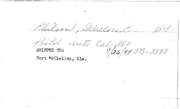 Cal .380, Shipped to: Fort McClellan, Ala. 9/26/44 5B-3398 -
