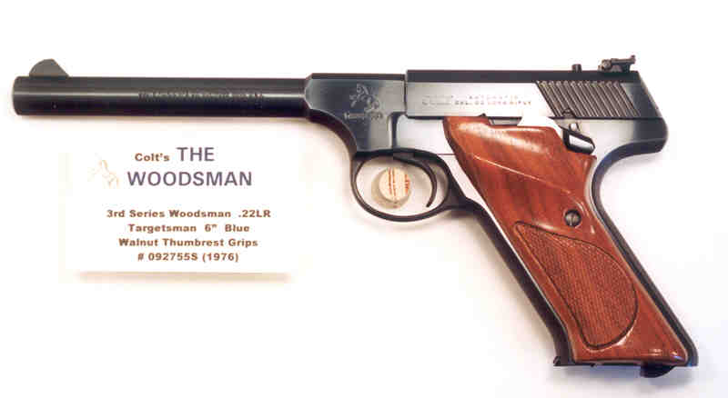 Woodsman 3rd Series Targetsman .22LR 6" Blue, NIB, SN#092755S (1976) with mint correct original walnut grips w/thumbrest, mint bore, correct mag, correct unique adjustable rear sight,  original Huntsman instruction sheet (these may have been issued with Huntsman instructions), Colt Authorized Warranty Service Stations brochure, Handling the Handgun brochure, Colt sight adjustment tool in kraft envelope, in outstanding correct woodgrain sleeve/styrofoam insert box with label intact and numbered to gun.  Gun is strikingly MINT and unfired!