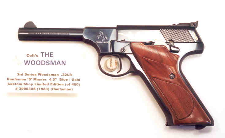 Woodsman 3rd Series Huntsman S Master Colt Custom Shop Limited Edition 1 of 400; .22LR 4.5" Royal Blue, NIB & Cased,  SN#309030S (1983) with mint correct beautifully figured (really nice) original walnut grips w/thumbrest, mint bore, correct mag, correct unique Elliason adjustable rear sight, unique (for Huntsman) slide stop mechanism/lever, original Xerox instruction sheet (they all were Xerox copies - 6 years after ending Woodsman production), list of authorized Colt warranty service stations and The Colt Companion brochure, Colt Congratulations! letter, The Colt Collection merchandise brochure w/order form, hang tag, in near mint correct woodgrain sleeve/styrofoam insert box with chartreuse Colt Custom Shop lable intact and numbered to gun.  Gun is finished in the striking high gloss Royal Blue (Python) finish accentuated by differing gold etchings on both sides of the slide and featuring a target shooter on the left (display) side.  Comes with walnut french-fitted display case with blue velvet interior and similar motif blue w/gold etchings edition plaque denoting Huntsman S Master Edition 1 of 400.  Display case is mint with key in kraft envelope.  Colt produced these as a parts clean-up effort 6 years after Woodsman production ceased and they were all 4.5" guns but around 285 had the regular untapered Huntsman barrel/front sight as does this gun and the remaining 115 had the tapered Sport model barrel with either the Sport trapezoidal front sight blade or the Target patridge front sight blade.  Some had 3rd Series triggers while this has a 2nd Series trigger.  Colt Factory Letter included.  Gun is strikingly MINT and unfired!